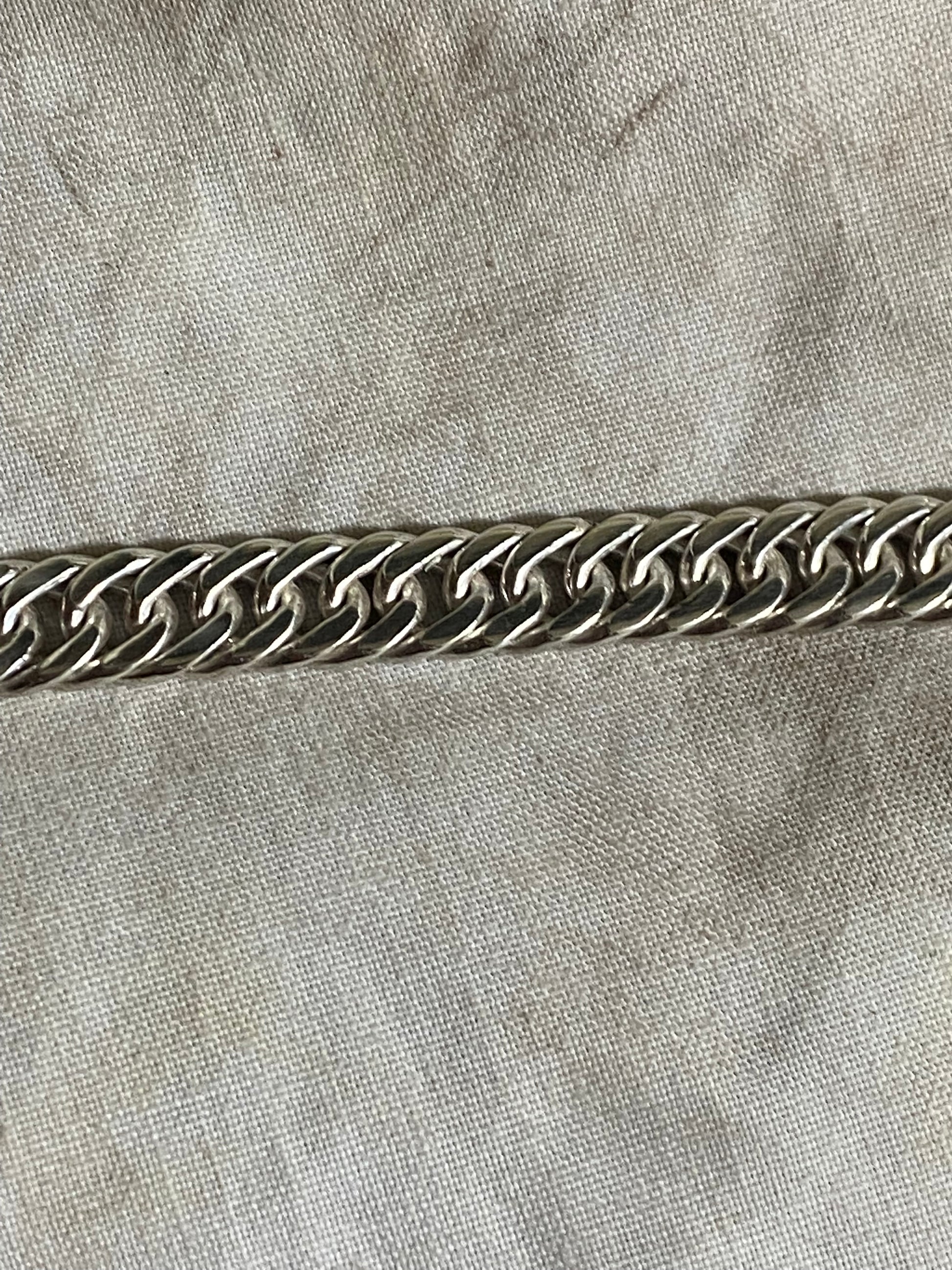 The interwoven links give the piece a clean yet substantial appearance, with natural weight and a smooth flow when worn. Finished to a bright mirror polish, the bracelet reflects light evenly across the surface, highlighting the precision of the link work and the purity of the fine silver.